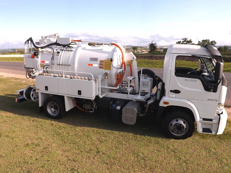 Caminhão combinado com bombas de hidrojateamento e auto vácuo. Utilizado para desobstrução de galerias, bueiros, bocas de lobo, caixas de gordura, tubulações de esgoto de até 2 metros de diâmetro e limpeza de fossa. Serviços de hidrojateamento com solução eficaz.